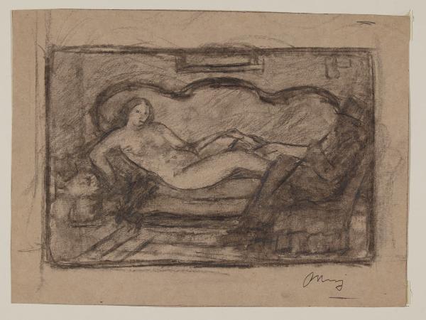 - NOTIZIE STORICO CRITICHE Il foglio, acquistato nel 1940 dalla vedova dell’artista, può essere messo in relazione con "La donna sul sofà" (cfr. A. Tiddia, Piero Marussig, Trieste 2015), un olio su tela datato al 1915. Il disegno mantiene in comune con il dipinto, oltre che la figura femminile nuda, raffigurata in controparte rispetto all’opera grafica, anche la forma del divano presente in molte altre opere del periodo. Numerosi sono, infatti, i disegni e i dipinti databili agli anni del primo conflitto mondiale che mantengono lo stesso schema compositivo e la stessa rappresentazione d’interni (Zatti, in Piero Marussig inedito - 200 disegni, Pavia 1988, p. 18 nn. 85-86). Il disegno, realizzato a carboncino, risulta sfumato da una leggera acquerellatura che ricopre tutto foglio.