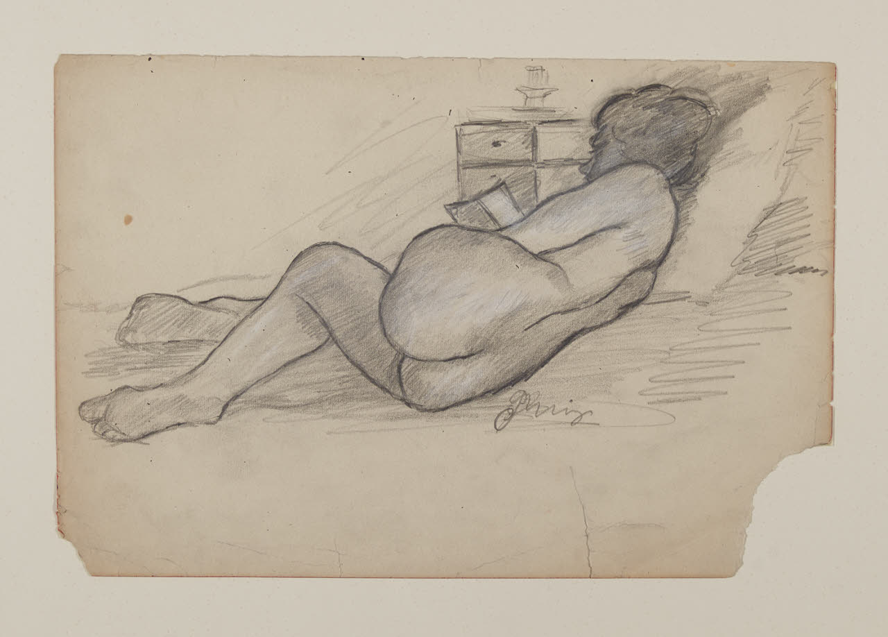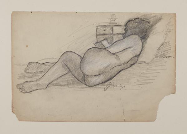 - NOTIZIE STORICO CRITICHE Il foglio, acquistato nel 1940 dalla vedova dell’artista, raffigura una figura femminile nuda vista di spalle e adagiata su un letto. Il suo corpo leggermente sproporzionato è creato con torniti e solidi volumi, tipici del gruppo di Novecento. Essa è realizzata con un tratto scuro di matita che circonda i contorni del suo corpo; il medim grafico, infatti, è insistente e marcato, e contorna la donna in una linea madre fortemente ondulata. La donna, contraddistinta da un forte vigore plastico, è caratterizzata da un chiaroscuro intenso e veloce e risulta tinteggiata da lumeggiature di gessetto bianco che investono alcune parti del suo corpo. Malgrado risulti difficile datare con precisione l’opera essa può essere ascritta, all’interno della produzione dell’artista, intorno alla metà degli anni Venti.