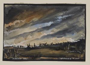 - NOTIZIE STORICO CRITICHE Cesarino Monti, nipote del pittore lombardo Cesare Monti, fu un "amante del colore" (Nicodemi 1941). L’artista, nel corso del secondo conflitto mondiale, combattè come soldato di fanteria sul fronte greco-albanese e nelle poche ore di sosta e con i pochissimi mezzi a sua disposizione, realizzò una serie di opere nel quale, secondo le parole di Nicodemi, "è riuscito sempre a dare la vivacità delle tinte ai suoi disegni; e non si fermò a guardare i suoi compagni soldati e gli aspetti della guerra. I costumi pittoresci degli albanesi lo attrassero, e fece squillare qualche bell’accordo cromatico nei loro raggruppamenti"(Ivi.). L’opera "Reticolati" ritrae un paesaggio dai toni cupi. Le travi issate sulla campagna scura sono descritte con piccole pennellate di colore nero e segnano la linea di confine del pendio che digrada verso l’orizzonte. Il cielo scuro e nuvolo, acceso solamente da alcuni bagliori più chiari, occupa un’ampia porzione dell’opera ed è segnato da lampi rossastri, come a suggerire che, altrove, qualche tragedia si sta consumando, mentre le nubi sembrerebbero alludere ad una imminente tempesta, segno che anche la natura non sorride all’uomo. L’uomo è totalmente assente nella raffigurazione, ma la sua impronta di distruzione nel terreno, quasi ferito da quella palizzata che assomiglia ad una corona di spine, è ben visibile. Il piccolo foglio, dopo il rientro dell’artista in Italia, fu esposto all’interno della Galleria del Milione e successivamente acquisto per le Civiche Raccolte milanesi. In seguito, nel dicembre dello stesso anno, fu pubblicato da Nicodemi in un articolo apparso su "Milano, rivista mensile del Comune".