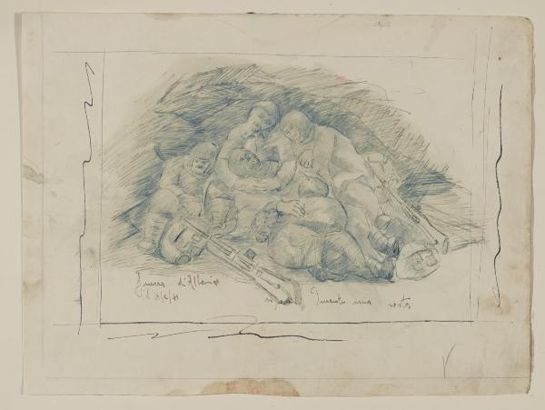 - NOTIZIE STORICO CRITICHE Nato nella provincia di Alessandria, nel capoluogo frequenterà le lezioni della scuola di Arte Applicata fin dall’età di quattordici anni, realizzando l’anno dopo la sua prima commissione pubblica di pittura.\nArruolato per la guerra in Africa orientale, trascriverà le sue impressioni in innumerevoli disegni, esposti nel 1937 in una mostra personale allestita dal G.U.F. (Gruppo Universitario Fascista) di Alessandria e pubblicati l’anno seguente con il titolo di "Impressioni d’Africa di un Legionario". Risale a questo periodo il trasferimento a Biella, città dove dimorerà per il resto della sua vita. Contemporaneamente prosegue l’attività espositiva, interrotta da una nuova chiamata alle armi - nel 1941 - con destinazione il fronte greco-albanese, del quale descriverà tutto l’orrore in un una serie di disegni, immediatamente esposti al suo rientro dal conflitto. Alla fine della guerra si distinguerà per il suo impegno politico e artistico in favore del ricordo della Resistenza, partecipando alle esposizioni per il decennale e il ventennale della Liberazione, e per la promozione della democrazia e della libertà. Fondamentale tappa di questo percorso fu l’esposizione "Sui monti della Grecia: cento disegni inediti di guerra" del 1972 presso il Museo Nazional del Risorgimento di Torino. Vivace interprete delle poetiche del Novecento, mai legato ad alcun movimento artistico, intrecciò amicizie profonde con alcuni dei maggiori artisti e intellettuali del XX secolo, incontrati presso il suo studio di via Italia a Biella dove fondò la «Saletta dell’Orso», cenacolo culturale e artistico di spiccata importanza. Il "Riposo durante una sosta" rappresenta un momento imprescindibile della vita sul fronte, qui condiviso da un gruppo di soldati che abbandonano a terra i propri zaini e le proprie armi e trovano riparo in una cavità rocciosa, accogliente quanto il ventre materno. Il gruppo è serrato, quasi a trasferire su carta quel senso comunitario che teneva ancorati alla vita gli uomini nella quotidiana crudeltà della guerra. Nell’opera emergono, nello stesso istante, una resa immediata e realistica e una tensione evocatrice nel fraterno abbraccio dei soldati che condividono la stessa dura sorte. Il tratto del disegno è estremamente semplice, dalle linee fluenti e sicure, che descrivono una quotidianità, quella dei soldati, dove il dramma è presente ed esaltato proprio dall’apparente normalità delle azioni che compiono. La composizione, dalla forte impostazione piramidale, è memore di ricordi antichi, a metà strada tra l’iconografia del "Compianto sul Cristo morto" e della "Deposizione nel sepolcro" - tra le altre cose suggerita dalla presenza della roccia - ci parla di un dolore atavico che accompagna la storia dell’uomo. La serie di disegni di Pozzi, realizzati dal vero sul fronte greco-albanese, si può ascrivere a quella categoria di opere che prevedono il contatto immediato e continuamente mutevole dell’artista con gli avvenimenti della storia. Costretto a calarsi immediatamente e completamente nell’opera, l’artista realizza un racconto per episodi, che - riuniti in un’unica sequenza - ci danno il senso dello svolgersi della narrazione. Il foglio , oggi conservato all’interno del Civico Gabinetto di Disegni del Castello Sforzesco di Milano, fu acquistato dalla Galleria del Milione nel 1941, in seguito a un’esposizione collettiva con i pittori Cesarino Monti e Angelo Pinciroli. Nel dicembre dello stesso anno, è stato riprodotto in un articolo pubblicato da Giorgio Nicodemi su "Milano, rivista mensile del Comune".