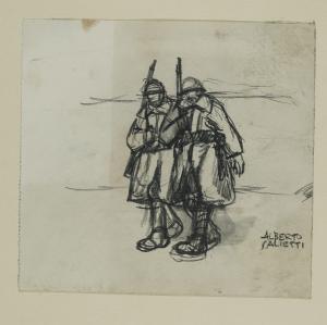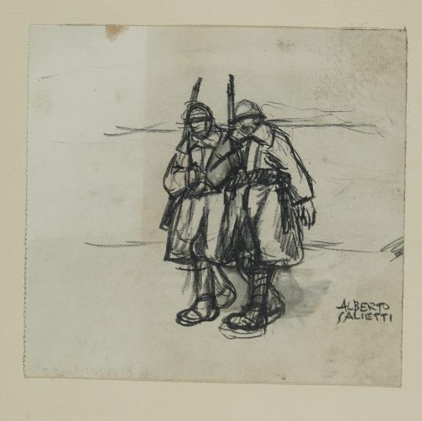 - NOTIZIE STORICO CRITICHE Sono gli anni della Prima Guerra Mondiale: Alberto Salietti ha 23 anni quando viene chiamato a combattere al fronte, e nei tre anni passati in battaglia esegue una serie di opere grafiche tra le più belle che ci sono finora pervenute. Dell'artista ferrarese il Gabinetto di Disegni del Castello Sforzesco conserva un gruppo di sette piccoli fogli di taccuino risalenti a questo periodo (invv. 6286 A 1936; 6287 A 1937; 6288 A 1938; 6289 A 1939; 6290 A 1940; 6291 A 1941; 6292 A 1942), acquistati dalla Galleria Casa d'Artisti nel 1933. Essi illustrano, attraverso un forte equilibrio chiaroscurale e un attento studio dell'impaginazione, alcune delle vicende vissute dai soldati al fronte. Sono appunti grafici eseguiti a carboncino, alcuni dei quali realizzati frettolosamente in trincea, nei campi di battaglia o nei momenti di pausa. In essi l'artista crea atmosfere intense grazie alla sapiente ponderazione di luci e ombre. Le figure dei soldati sono bloccate in diverse situazioni, all'interno di spazi angusti, nel sotterraneo della trincea, nella vasta campagna, riuniti intorno a una mensa o in piedi come vedette. Seppur ancora legati alla tipica tradizione ottocentesca lombarda, tali disegni sono caratterizzati da una sicurezza nello studio della composizione e da una plasticità delle forme che preannuncia quanto avverrà nella pittura dell'artista intorno agli anni Venti.\nUna suggestiva descrizione di questi fogli è quella formulata da Marina De Stasio, la quale scrive: "I Sette disegni di guerra sono opere curate, disegni realizzati con forte segno pittorico, l'immagine è tagliata originalmente, in modi diversi a seconda del tema della composizione; le figure sono senza volto, ma non senza anima, c'è un sentire collettivo, un soffrire in vari modi la stessa ansia". E continua: "al vivo interesse formale, che si manifesta per esempio nell'attenzione all'uso dello spazio bianco del foglio di carta, si accompagna un'intensa consapevolezza del dramma che sta avvenendo" (De Stasio 1991).\nInoltre, come ricordato da Arnanda Dallaj, disegni analoghi "vennero preparati nel 1917 per corredare nella 'Lettura' di dicembre il frontespizio e la prosa di G. Castellini Ore di un diario non scritto (pp. 935-939)" (Dallaj 1991).