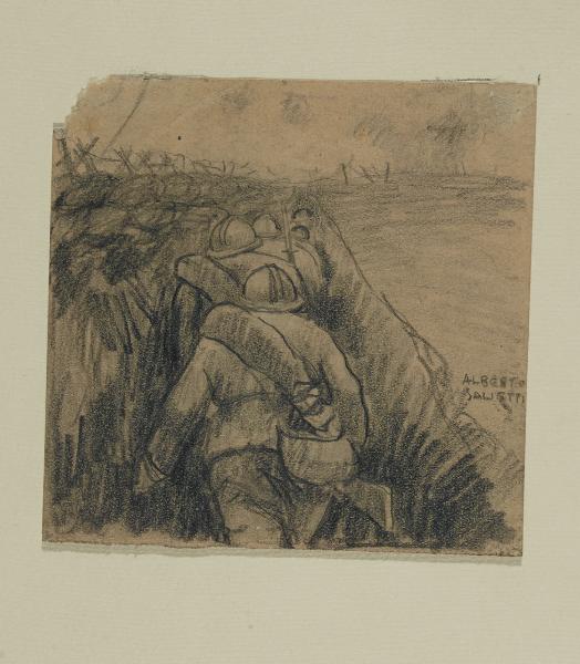 - NOTIZIE STORICO CRITICHE Sono gli anni della Prima Guerra Mondiale: Alberto Salietti ha 23 anni quando viene chiamato a combattere al fronte e nei tre anni passati in battaglia esegue una serie di opere grafiche tra le più belle che ci sono finora pervenute. Dell'artista ferrarese il Gabinetto di Disegni del Castello Sforzesco conserva un gruppo di sette piccoli fogli di taccuino risalenti a questo periodo (invv. 6286 A 1936; 6287 A 1937; 6288 A 1938; 6289 A 1939; 6290 A 1940; 6291 A 1941; 6292 A 1942), acquistati dalla Galleria Casa d'Artisti nel 1933. Essi illustrano, attraverso un forte equilibrio chiaroscurale e un attento studio dell'impaginazione, alcune delle vicende vissute dai soldati al fronte. Sono appunti grafici eseguiti a carboncino, alcuni dei quali realizzati frettolosamente in trincea, nei campi di battaglia o nei momenti di pausa. In essi l'artista crea atmosfere intense grazie alla sapiente ponderazione di luci e ombre. Le figure dei soldati sono bloccate in diverse situazioni, all'interno di spazi angusti, nel sotterraneo della trincea, nella vasta campagna, riuniti intorno a una mensa o in piedi come vedette. Seppur ancora legati alla tipica tradizione ottocentesca lombarda, tali disegni sono caratterizzati da una sicurezza nello studio della composizione e da una plasticità delle forme che preannuncia quanto avverrà nella pittura dell'artista intorno agli anni Venti.\nUna suggestiva descrizione di questi fogli è quella formulata da Marina De Stasio, la quale scrive: "I Sette disegni di guerra sono opere curate, disegni realizzati con forte segno pittorico, l'immagine è tagliata originalmente, in modi diversi a seconda del tema della composizione; le figure sono senza volto, ma non senza anima, c'è un sentire collettivo, un soffrire in vari modi la stessa ansia". E continua: "al vivo interesse formale, che si manifesta per esempio nell'attenzione all'uso dello spazio bianco del foglio di carta, si accompagna un'intensa consapevolezza del dramma che sta avvenendo" (De Stasio 1991).\nInoltre, come ricordato da Arnanda Dallaj, disegni analoghi "vennero preparati nel 1917 per corredare nella 'Lettura' di dicembre il frontespizio e la prosa di G. Castellini Ore di un diario non scritto (pp. 935-939)" (Dallaj 1991).