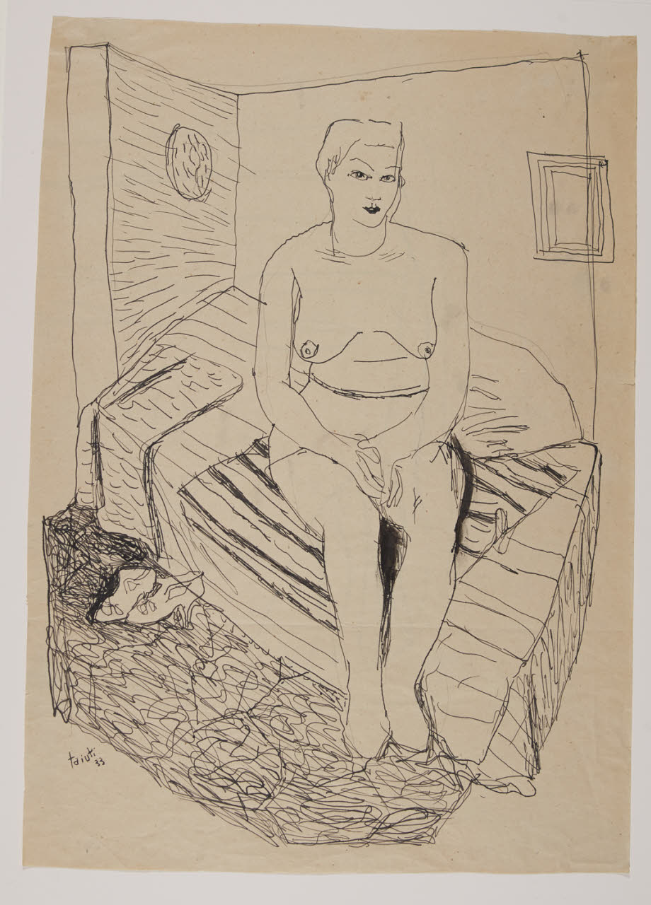- NOTIZIE STORICO CRITICHE Lo "Studio di giovane nuda seduta" giunge nelle raccolte civiche qualche mese dopo la mostra collettiva di "Quattro giovani pittori" (Afro, Bosisio, Pittino e Taiuti), inaugurata negli spazi della Galleria Il Milione, il 24 gennaio del 1933. Il registro di carico delle raccolte indica l'acquisto del foglio nell'agosto dello stesso anno presso l'autore, mentre la scheda dell'istituto specifica invece la provenienza dalla Galleria. È pertanto probabile, così come osservato da Elena Vilardi, che l'artista sia stato contattato per l'acquisto in un momento successivo rispetto alle date della mostra. Tuttavia il ruolo della galleria risulta ugualmente importante in quanto tramite tra l'istituzione pubblica e gli artisti espositori (Vilardi 2001-2002). \nTaiuti realizza a penna una figura femminile nuda seduta su un letto, mediante un tratto estremamente sintetico messo in risalto da tinteggiature a inchiostro di china. La donna è posta all'interno di una stanza vista prospetticamente, occupandone l'angolo più vicino all'osservatore. Sia la figura che gli oggetti sono ottenuti attraverso una sintesi formale e un rigore compositivo, celato dalla libertà del tratto che velocemente descrive in maniera sintetica tutti gli elementi dell'opera (Ivi.).\nSul verso del foglio è presente lo schizzo di una testa, probabilmente eseguito in precedenza all'opera in esame.