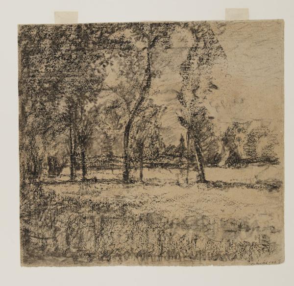 - NOTIZIE STORICO CRITICHE Il disegno a carboncino Paesaggio alberato di Arturo Tosi fu acquistato nel dicembre del 1930 dalla Galleria Milano insieme allo Studio di nudo femminile (inv. 6293 F 20) di Alberto Salietti e allo Studio di donna seduta (inv. 2772 E 56) di Achille Funi (Garberi 1991). Il foglio, accostato da Arnalda Dallaj alle opere eseguite dall'artista dopo il 1925, si caratterizza per una costruzione spaziale a campiture parallele e per il particolare chiaroscuro. Il carbonino, mescolato al supporto ruvido della carta, unifica l'atmosfera e scandisce la successione dei piani della rappresentazione (Dallaj 1991). Nel disegno del Castello Sforzesco si assiste a una particolare attenzione per la natura e per il paesaggio. Questi elementi però non sono indagati con minuta realisticità, ma sono trasfigurati attraverso ardenti valori espressivi e variazioni chiaroscurali di forte intensità espressiva.