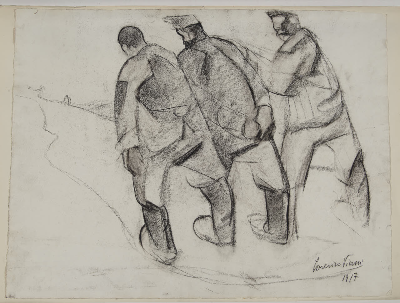 - NOTIZIE STORICO CRITICHE Il foglio con i "Prigionieri austriaci"fu acquistato dalle Civiche Raccolte milanesi nel 1924 in occasione della Mostra di Guerra degli artisti combattenti e mutilati, esposizione collettiva nella quale l'opera fu presentata insieme ad altre ottantasette "impressioni" di guerra realizzate dall'artista toscano. L'opera, eseguita a carboncino, raffigura tre figure maschile viste a tergo. Si osservano, infatti, due prigionieri austriaci condotti da un soldato nemico lungo una strada leggermente abbozzata. In quest'opera Viani dà forma alle proprie figure attraverso marcature e accenti disuguali di carboncino; in essi l'artista mostra pentimenti e correzioni, appositamente lasciati in evidenza per marcarne la propria vitalità esecutiva.