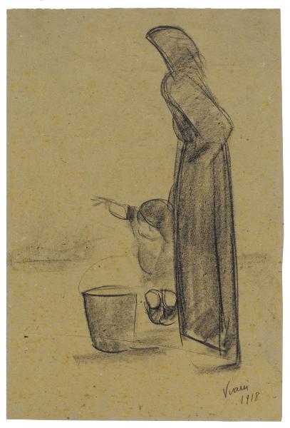 • NOTIZIE STORICO CRITICHE Il disegno "I profughi" fu acquistato dalla Civiche Raccolte milanesi in occasione della Mostra di Guerra degli artisti combattenti e mutilati nel 1924, manifestazione nella quale l'opera fu esposta insieme ad altri ottantasette "impressioni" di guerra realizzate dall'artista. Il foglio è collegabile, inoltre, a diverse opere grafiche di Viani in cui il drammatico protagonista è il popolo più disperato. Esso incarna quel sentimento di riflessione sulla sofferenza dell'uomo e sul disaggio esistenziale prodotto dal conflitto bellico. Nell'opera Viani descrive due figure senza volto abbozzate attraverso veloci tratti di carbonino i quali si fanno più intensi nei contorni che descrivono le figure. Affrontando il tema della guerra come un doloroso ed epico racconto popolaresco, Viani sagoma due asciutte figure, vestite di nero, segnate dalla sofferenza e dalla fatica. Quella in primo piano, in particolare, sembra mostrare un lutto perpetuo, rimanendo immobile e muta, come sigillata in un antico e traumatico silenzio.