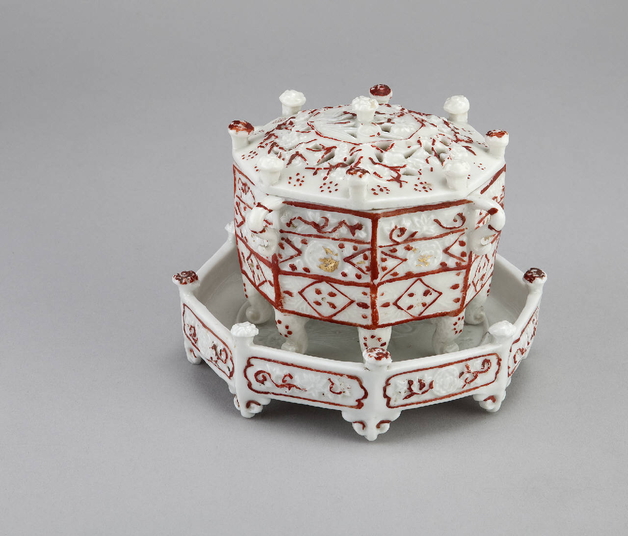 Incensiere ottagonale in porcellana bianca. Possiede otto piedini sinuosi posti ai vertici e quattro anse per la sospensione. Il coperchio è traforato e presenta un pomello centrale a motivo floreale e altri otto pomelli ad ogni vertice. Le facce sono decorate con medaglioni che sono stati dorati e dipinti grossolanamente di rosso. Poggia su vassoio con medesimo decoro.