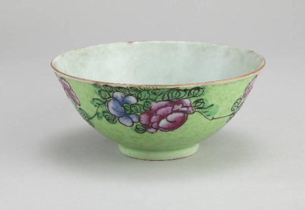 Ciotola in porcellana decorata internamente a smalto bianco, esternamente verde con decorazioni floreali policrome, marchio Daoguang alla base.