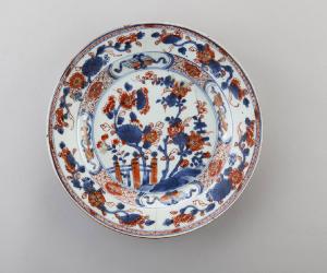 Piatto in porcellana a smalti Imari nei toni del blu e del rosso con lumeggiature decorato al centro con crisantemo e peonia, bordato da motivi geometrici floreali stilizzati.