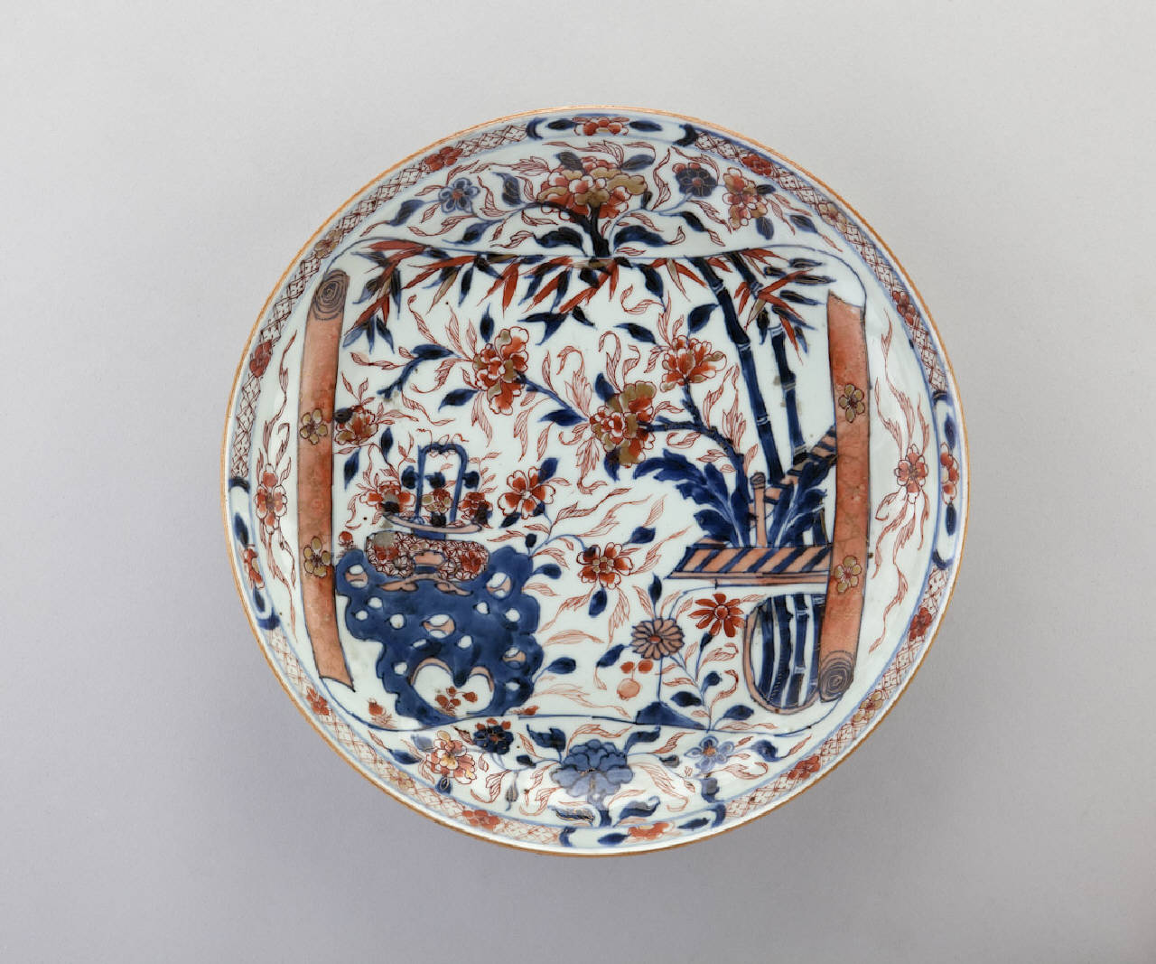 Piatto fondo in porcellana a smalti Imari nei toni del blu e del rosso con lumeggiature decorato al centro con rami di bambù e e cesto di peonie in fiore all'interno di cartella a guisa di pergamena.