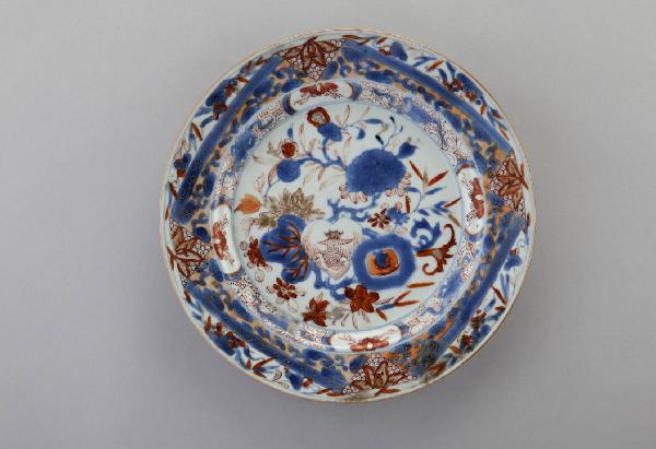 Piatto in porcellana a smalti Imari nei toni del blu e del rosso con lumeggiature, decorato con motivi floreali e geometrici.