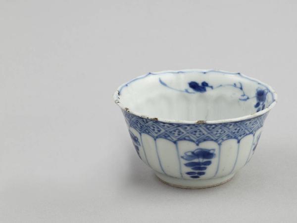 Coppetta in porcellana bianca e blu dal corpo modellato e dal bordo lobato, decorata con motivi floreali e geometrici.