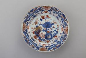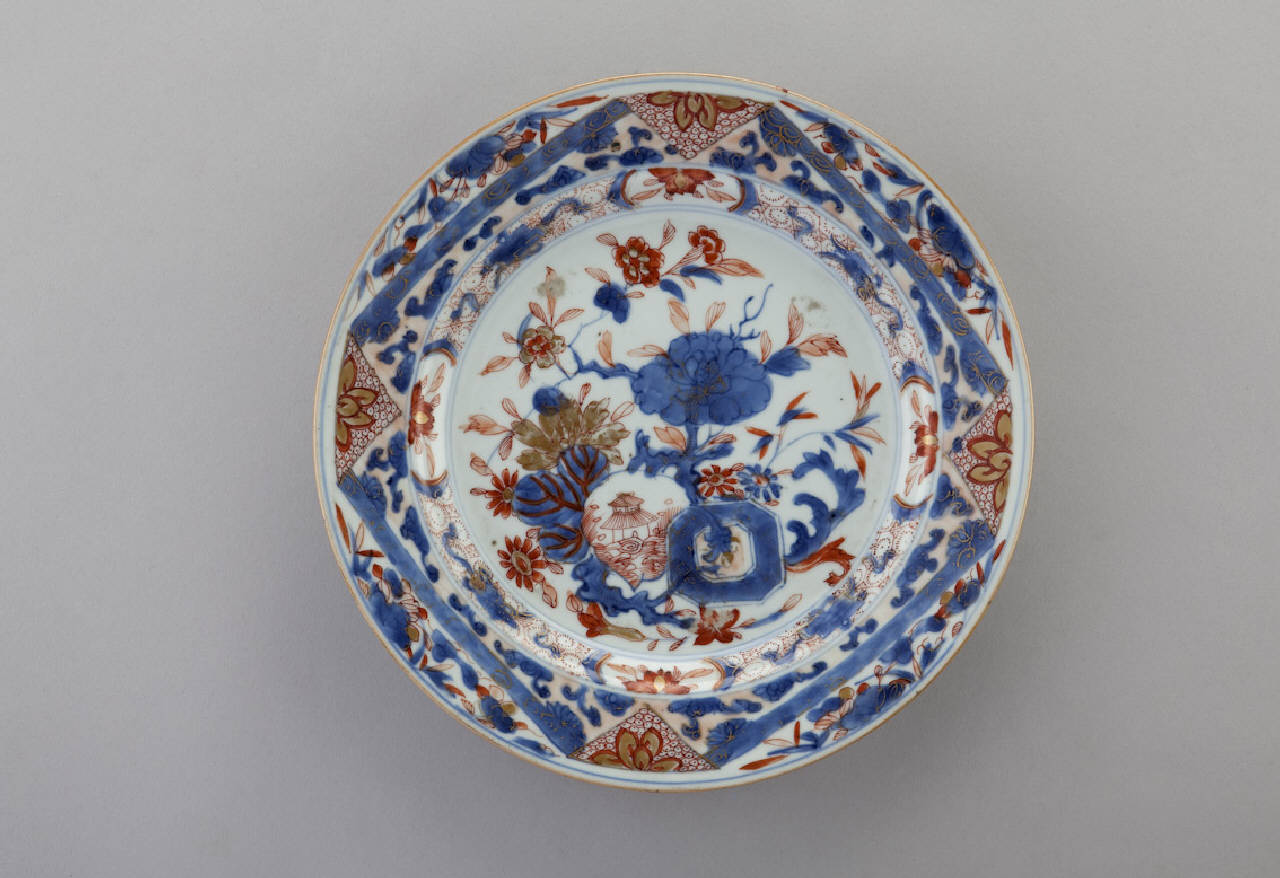 Piatto in porcellana a smalti Imari nei toni del blu e del rosso con lumeggiature, decorato con motivi floreali e geometrici.