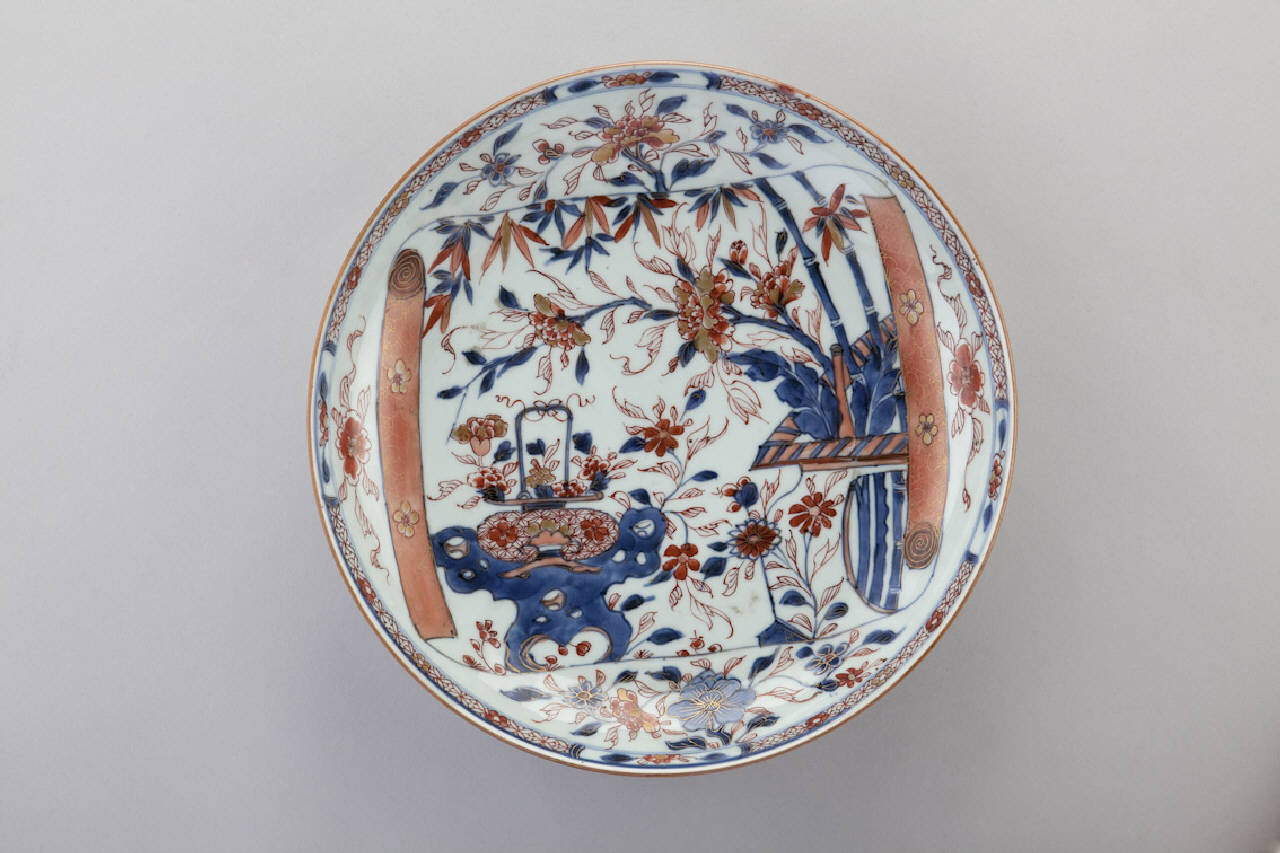 Piatto fondo in porcellana a smalti Imari nei toni del blu e del rosso con lumeggiature, decorato al centro con rami di bambù e cesto di peonie in fiore all'interno di cartella a guisa di pergamena.