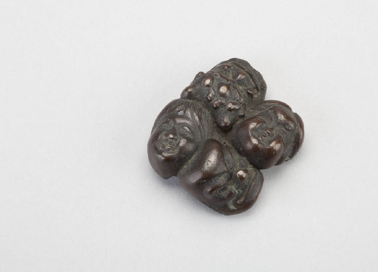Netsuke in bronzo raffigurante gruppo di sette maschere teatrali.