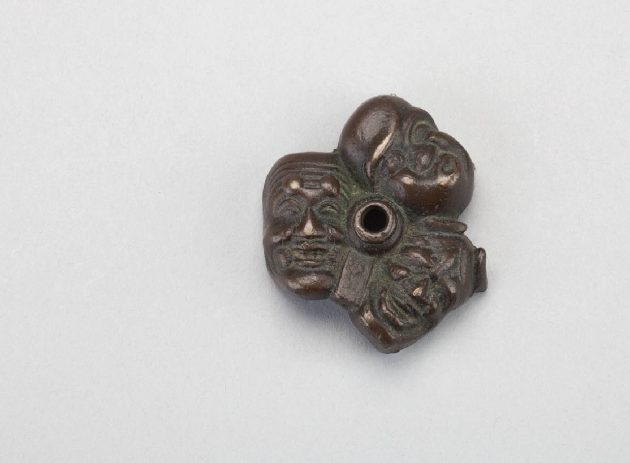 Netsuke in bronzo raffigurante gruppo di sette maschere teatrali.