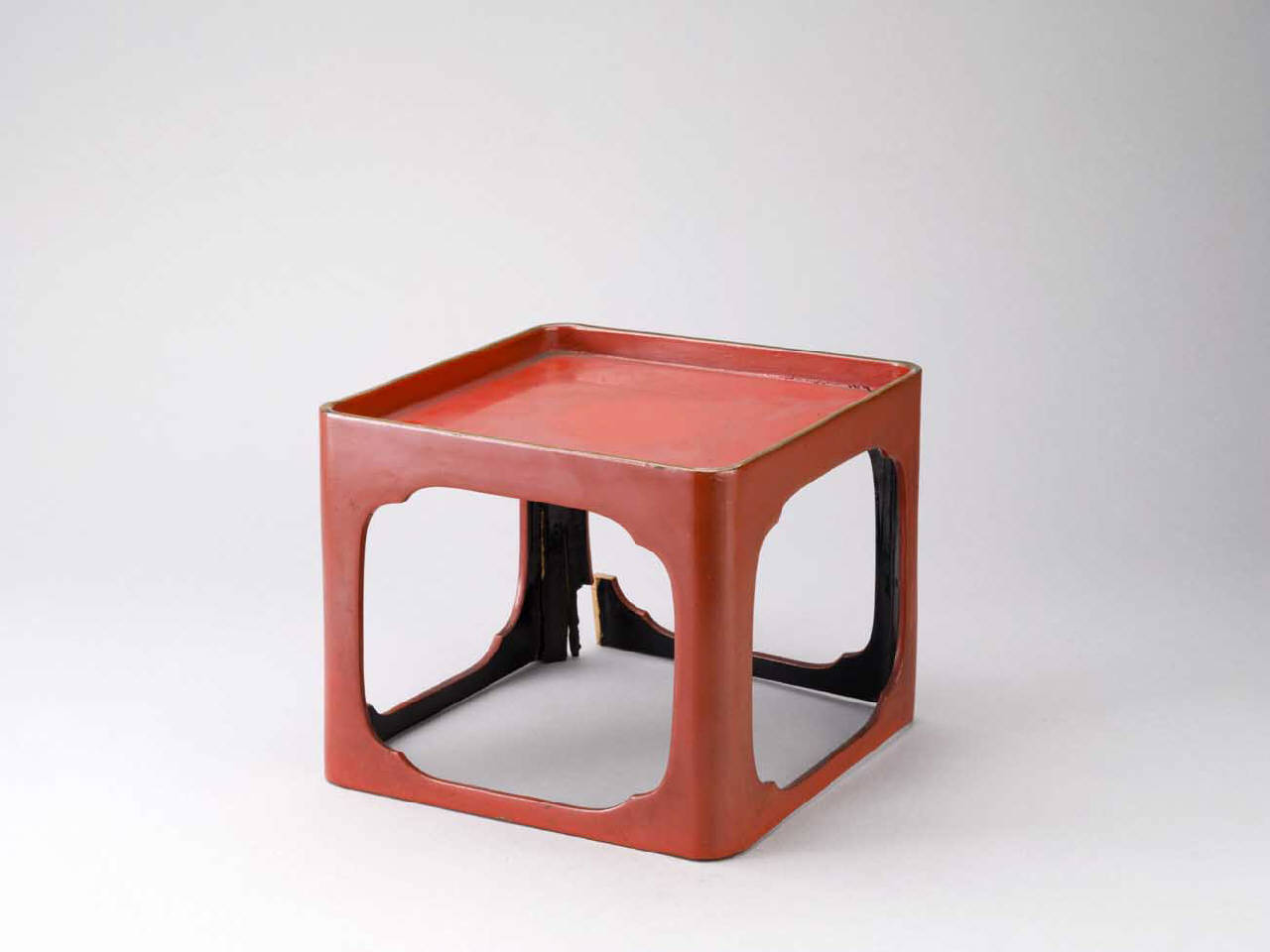 Piccolo tavolino in legno di forma quadrata con gambe raccordate da traverse. E' in legno laccato di rosso.