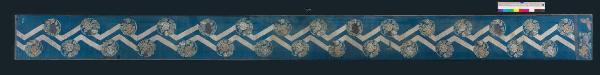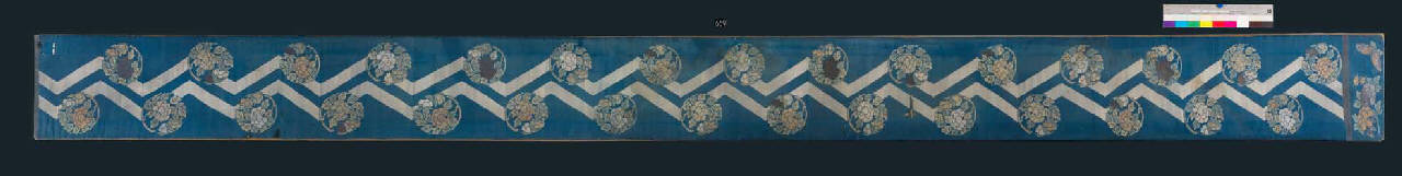 Lunga fascia di seta (obi) per la vestizione dell'abito femminile. Seta con decorazione a medaglioni floreali policromi alternati su fondo blu con due fasce bianche parallele centrali a zigzag.