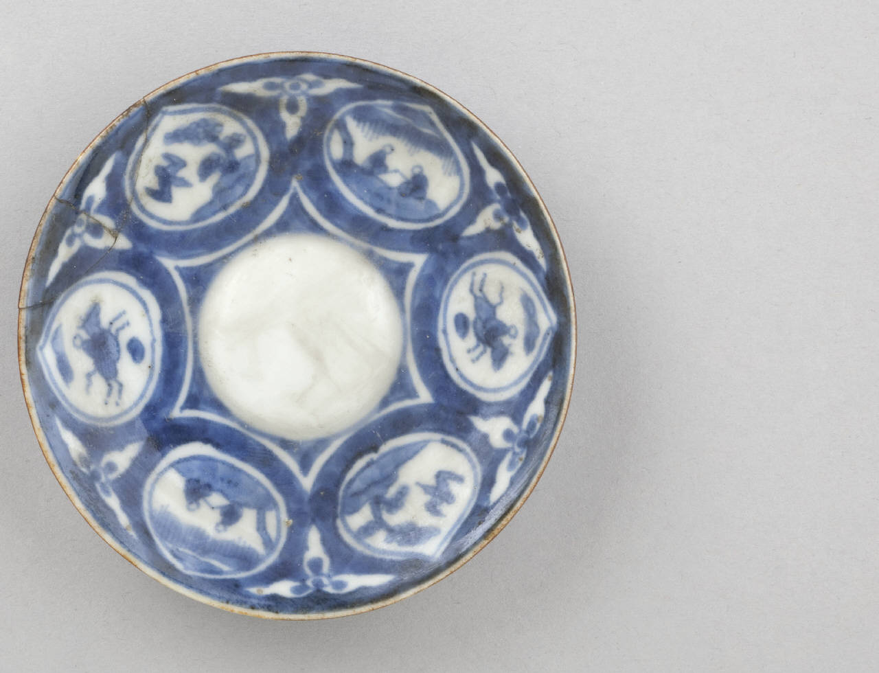 Piattino circolare in porcellana dipinto in blu al di sotto dell'invetriatura trasparente. Sulla superficie a vista, tra fondo e tesa, si stagliano radialmente sei riserve a goccia, all'interno di ognuna delle quali è raffigurata una piccola scena, tra scorci di paesaggio, figure, animali, fiori e uccelli.