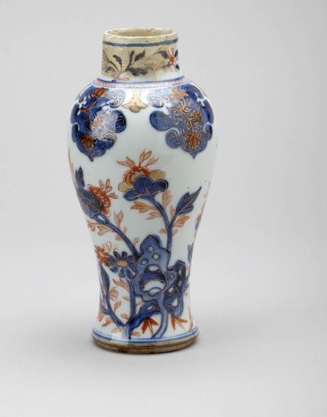 Piccolo vaso a balaustro in porcellana a smalti Imari nei toni del blu e del rosso conlumeggiature decorato con motivi floreali.