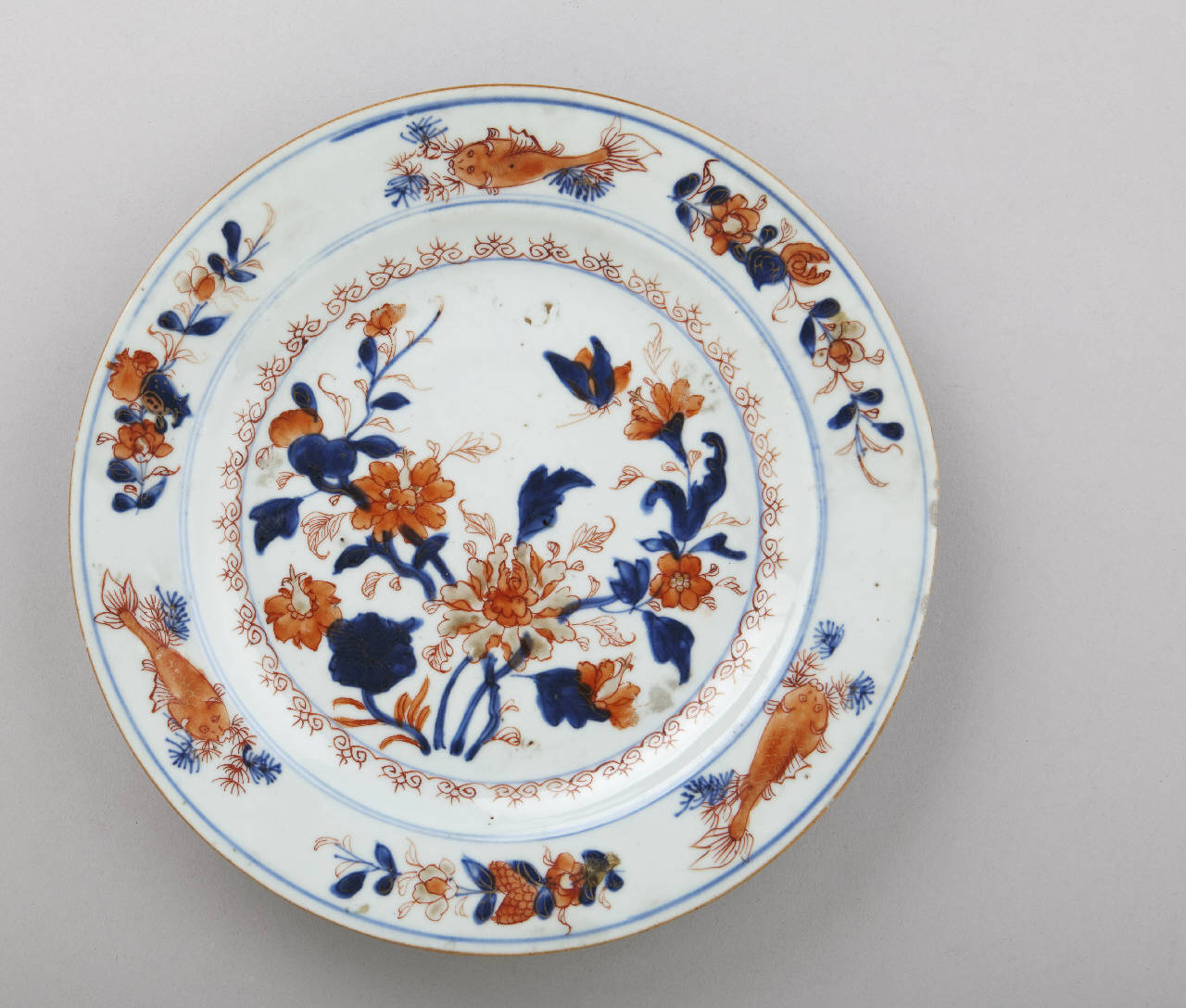 Piatto in porcellana a smalti Imari nei toni del blu e del rosso con lumeggiature decorato al centro con rami di peonia in fiore, la tesa alterna carpe e motivi floreali