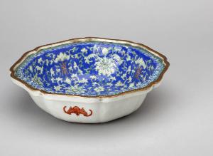 Ciotola ottagonale dal bordo lobato in porcellana a smalti nei toni del verse su fondo blu scuro, decorata all'interno con foglie e fiori di loto e caratteri benauguranti "shou". Il bordo presenta una banda decorativa di teste di "ruyi"; l'esterno una decorazione con pipistrelli capovolti "bianfu", in smalti rosso ferro. La base non è invetriata.