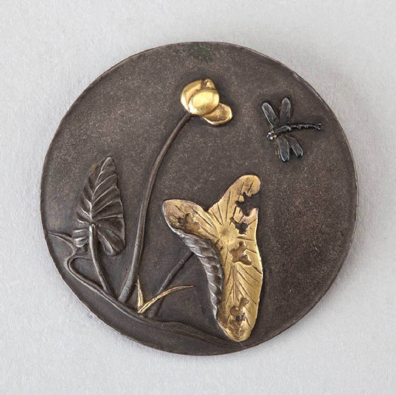 Parte di netsuke, bottone in bronzo patinato e oro con libellula e fiore di loto.