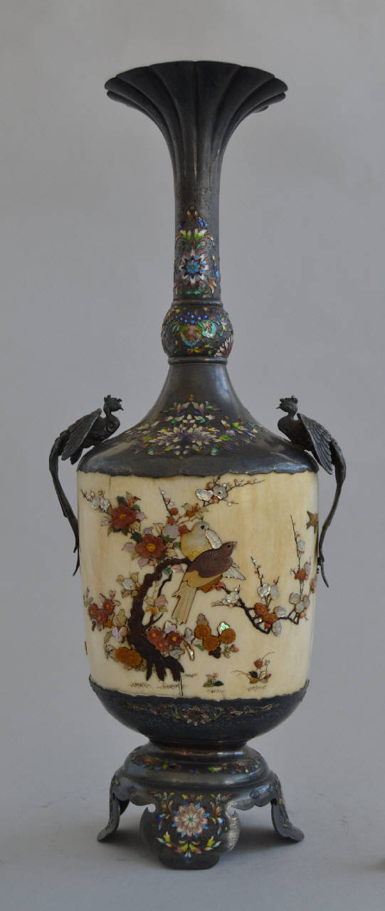 Vaso costituito da una sezione di zanna d'elefante montata con piede e collo d'argento. Il piede d'argento è a base circolare poggiante su quattro piedini modanati, rastremato superiormente per aprirsi a coppa a supportare la sezione di zanna. Sulla spalla, bassa, in argento, terminante in un lungo collo con rigonfiamento a tre quarti e strombatura finale con orlo lobato, si trovano due anse applicate, d'argento, a forma di fenice. Le sezioni in argento sono decorate a smalti cloisonné a più colori, con motivi floreali. La pancia, costituita dalla zanna d'avorio, è intarsiata in madreperla colorata, carapace di tartaruga, corallo, corno e legno con disegno di due uccelli sopra un racemo fiorito e una quaglietta fra gli arbusti.