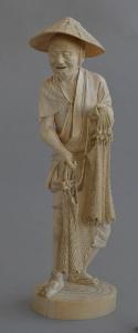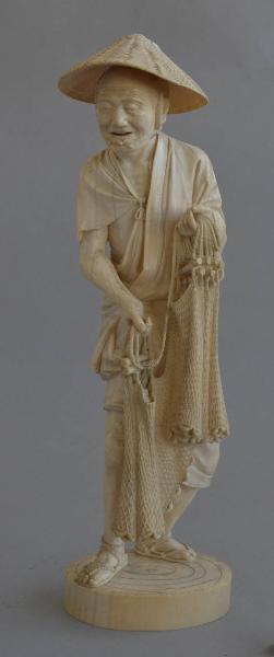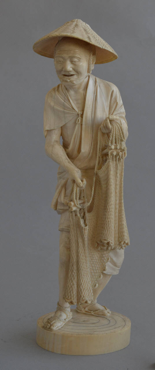 Statuetta d'avorio raffigurante un anziano pescatore in abiti tradizionali, con sandali di corda e cappello di paglia in testa, mentre regge ordinatamente una rete con la mano sinistra leggermente alzata e ritratta e la destra tenuta un po' più in basso, lo sguardo rivolto in basso a destra. Fa corpo con una base bassa e circolare.