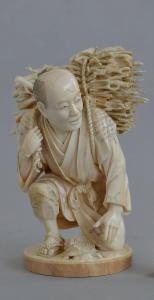 Statuetta raffigurante un raccoglitore di legna accosciato. L'uomo, che porta la tipica acconciatura maschile con rasatura tradizionale, tiene la fascina di rami legata sulla schiena e volge la sua ttenzione sulla sinistra. Alla sua cintura è appesa una borsetta per il tabacco e la custodia per la pipa, legate a un fermaglio a forma di fungo cinese. Un ramoscello della fascina ha ancora un frutto di cachi attaccato. Ai pidi dell'uomo un ceppo di legno. La statuetta fa corpo con una base circolare dove è intagliato il terreno irregolare del bosco.