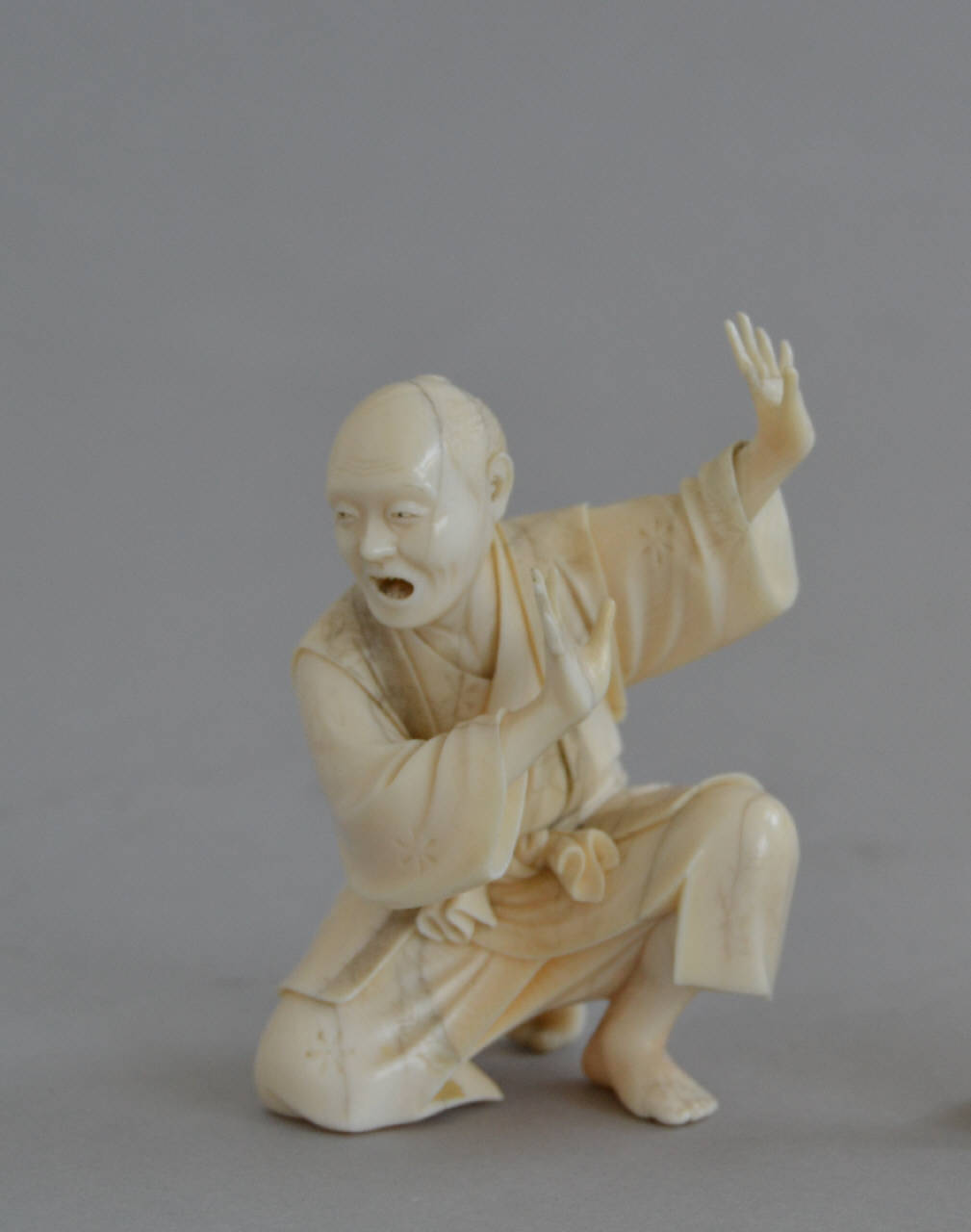 - NOTIZIE STORICO CRITICHE La statuetta doveva far parte di una composizione. In mancanza di altri elementi non si intuisce che cosa abbia spaventato l'uomo, che sembra proteggersi da qualcosa che arriva alla sua sinistra, ma che in effetti prende una posa che rappresenta il timore. Sono molte le statuine raffiguranti persone nella medesima posizione, allarmate solitamente dalla presenza di rettili o di topi.