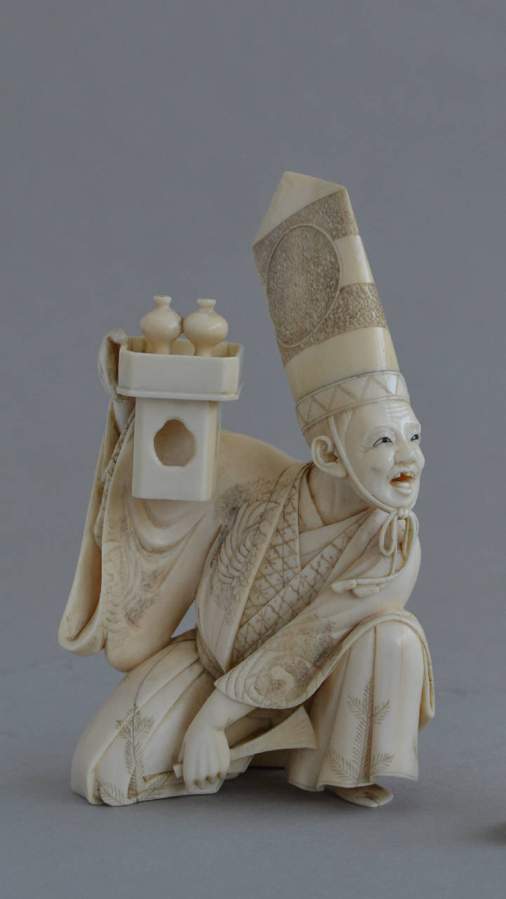 Statuetta raffigurante un prete scintoista accosciato che tiene nella mano destra, sollevata, un tavolino cerimoniale per altare con sopra due bottigliette votive per il sake. Nella destra, tenuta in basso, un ventaglio chiuso. Dietro di lui, per terra, si trova un cofanetto chiuso. Il prete indossa l'abito tradizionale con il lungo cappello rigido. I particolari incisi della veste e del cappello sono scuriti di grigio.