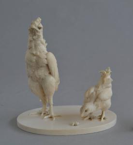 Scultura in avorio raffigurante una coppia di galli. L'occhio è reso in madreperla. Uno, adulto, si allunga verso l'alto come ad osservare qualcosa di fronte a lui, l'altro, più piccolo, forse na gallina, osserva da vicino un ragno che si trova al suolo. La composizione è incollata su una base in avorio piatta e circolare, moderna.