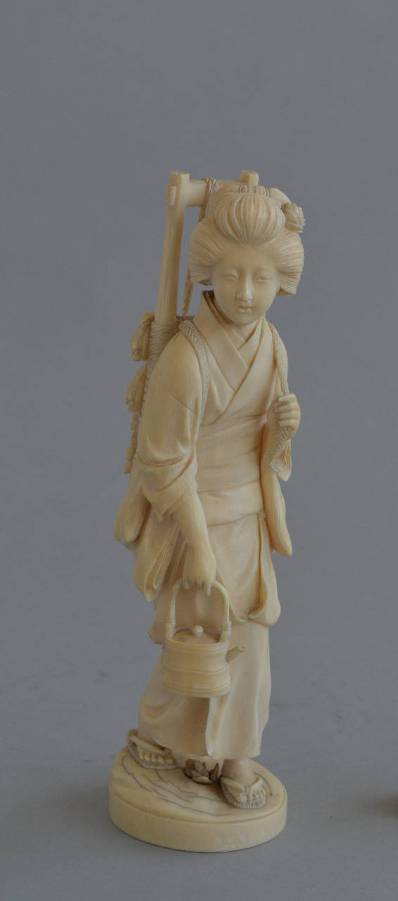 Statuetta in avorio di donna che incede portando sulle spalle una cornice di legno e corda alla quale sono legate delle fascine di piante con frutti a forma di pannocchia. La donna, che indossa una lunga veste con grande fascia centrale e porta una elaborata capigliatura tenuta in forma da un fermacapelli a pettine in combinazione con un cerchietto di perle e un foulard, al quale si aggiunge un fiore tenuto frontalmente sulla sinistra, regge nella mano destra un bricco a forma di teiera con manico a ponte e beccuccio, e con la mano sinistra si appende alla bretella che passa davanti alla spalla corrispondente.