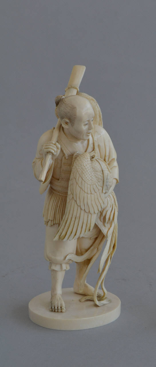 Statuetta in avorio raffigurante un pescatore con le ali di una fenice tra le braccia. Il pescatore regge il volatile con la mano sinistra mentre con la destra tiene un remo al quale è appesa la rete da pesca. La lunga coda del mitico ucello ricade fino a terrra. L'uomo è scalzo e indossa la veste tradizionale costituita da giacchetta e pantaloni, più una copertura di paglia che copre il petto e la vita. Alla cinta è appesa una borsetta costruita con una conchiglia, al quale è atacato un altro oggetto a cannuccia. Fa base con un basso piattello ovale.