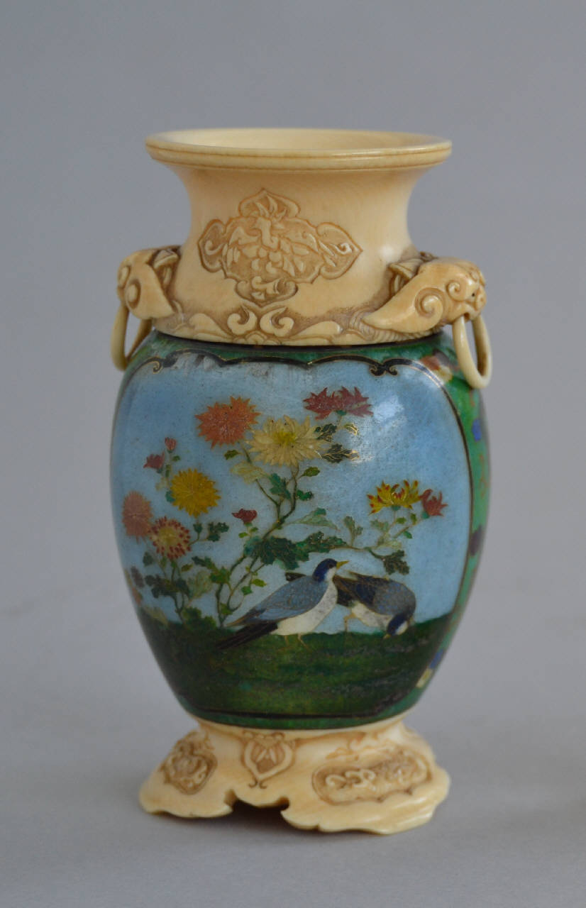 Vasetto in avorio e cloisonné. La pancia, ovoidale, è totalmente realizzata a smalti policromi e mostra due cartigli lobati campiti da fiori e uccelli. Da un lato si trovano due colombi (?) fra i crisantemi e dall'altro si trova una pavoncella fra peonie. Fra i due cartigli, in campo verde, su un lato è raffigurato un dragone, mentre sull'altro si trova un decoro floreale. Collo e piede sono realizzati in avorio e si incastrano all'interno della pancia in cloisonnè lasciando che questa possa muoversi circolarmente. Alla base del collo si trovano due protomi sporgenti a mascherone, con anse ad anello fra le fauci. Fra le due protromi si trovano dei cartigli intagliati da un fiore e da una fenice. In coppia con il precedente.