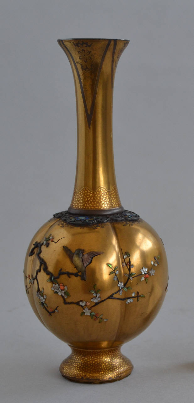 Vasetto in lacca dorata caratterizzato da un lungo collo terminante a bocca strombata, con pancia sferica, lobata, divisa in a quattro sezioni terminante con un piede che si espande a tronco di cono. La pancia è decorata con incrostazioni polimateriche a prevalenza di madreperla sagomata, di vari colori. Il disegno raffigura un cesto di vimini intrecciati appeso a tre rametti incrociati. All'interno del cesto si trovano foglie e rametti di fiori. Sul lato opposto si trovano un ramo fiorito e un uccellino. La spalla è interessata da una placca d'argento lobata, con decori a rilievo di fiori a smalti cloisonnée. Il vasetto presentava due anse anse sinuose a forma di stelo di bambù\n che sono state tolte dal collo e una base tripode in argento con piedini anch'essi ricurvi e a forma di bambù. In coppia con il precedente.