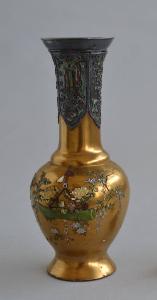 Vasetto dal lungo collo terminante a bocca strombata, con pancia ovoidale che si rastrema al piede, espanso a tronco di cono. La pancia è decorata con incrostazioni polimateriche a prevalenza di madreperla sagomata di vari colori. Il disegno raffigura un vasetto di bambù con fiori, una brocca, un incensiere arcaicistico, un vaso tripode su tavolino e un'altro recipiente tripode. Su tutta la superficie si trovano inoltre fiori e racemi. La bocca e parte del collo sono coperti da una placca d'argento con decori a rilievo di girali in smalti cloisonnée. Il vasetto presentava due anse a forma di bambù piegato a ferro di cavallo che sono state tolte e una base tripode in argento con piedini anch'essi ricurvi e a forma di bambù. In coppia con il sucessivo.