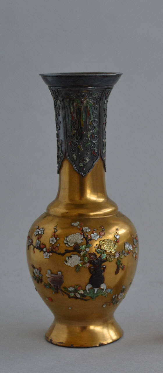 Vasetto dal lungo collo terminante a bocca strombata, con pancia ovoidale che si rastrema al piede, espanso a tronco di cono. La pancia è decorata con incrostazioni polimateriche a prevalenza di madreperla sagomata di vari colori. Il disegno raffigura un vasetto di bambù con fiori, una brocca, un incensiere arcaicistico, un vaso tripode su tavolino e un'altro recipiente tripode. Su tutta la superficie si trovano inoltre fiori e racemi. La bocca e parte del collo sono coperti da una placca d'argento con decori a rilievo di girali in smalti cloisonnée. Il vasetto presentava due anse a forma di bambù piegato a ferro di cavallo che sono state tolte e una base tripode in argento con piedini anch'essi ricurvi e a forma di bambù. In coppia con il precedente.
