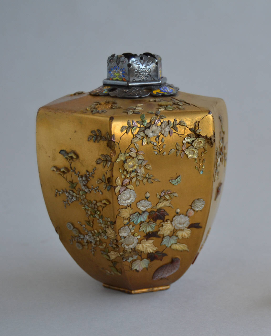 Vasetto a pianta esagonale con spalla alta, squadrata e pareti che si rastremano al piede. Tutto il vasetto è laccato in oro e decorato con incrostazioni policrome di madreperla sagomata, avorio e altri materiali, a motivo di piccioni su un ramo fiorito, un uccello in volo e una quaglietta a terra in mezzo ad altri fiori. La bocca del vasetto è realizzata in argento con bordo sagomato e traforato ed è decorata a fiori con smalti cloisonnée. In coppia con il seguente.