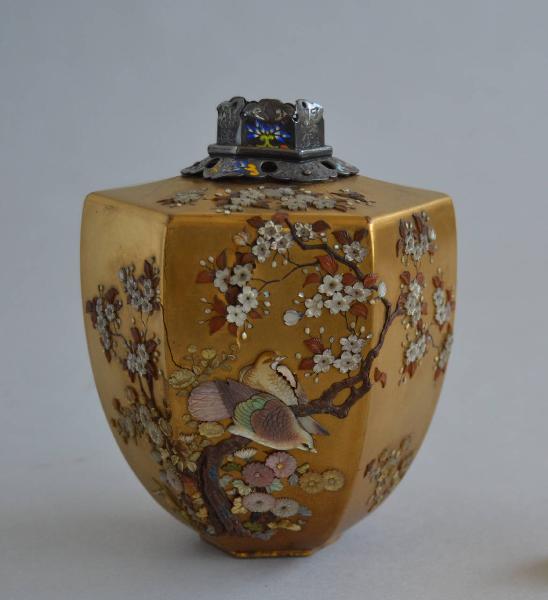 Vasetto a pianta esagonale con spalla alta, squadrata e pareti che si rastremano al piede. Tutto il vasetto è laccato in oro e decorato con incrostazioni policrome di madreperla sagomata, avorio e altri materiali, a motivo di piccioni su un ramo fiorito, un uccello in volo e una quaglietta a terra in mezzo ad altri fiori. La bocca del vasetto è realizzata in argento con bordo sagomato e traforato ed è decorata a fiori con smalti cloisonnée. In coppia con il precedente.