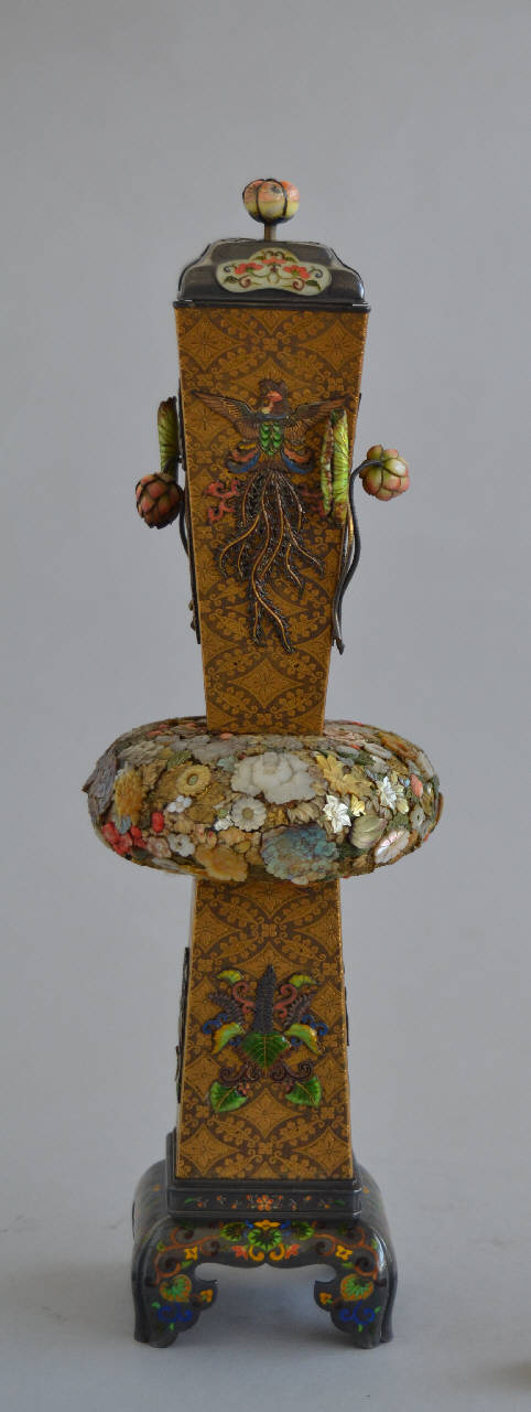 Vasetto d'argento laccato a fondo oro, costituito da due corpi opposti a tronco di piramide schiacciata ai vertici a formare una pianta romboidale, uniti al centro da un corpo sporgente a ciambella Il tronco di cono superiore ha il bordo in argento sopra il quale si incastra un coperchio d'argento dal profilo piramidale, con pomolo centrale a forma di bocciolo di loto semi schiuso, superficie superiore traforata a petali e su ogni lato quattro riserve lobate decorate a smalti cloisonnée con fiori. Il tronco di cono inferiore si inserisce su una base d'argento decorato in cloisonné, a forma di tavolino con ai vertici quattro piedini sagomati. Il corpo a ciambella è tutto incrostato di madreperla colorata corallo e carapace di tartaruga intagliati a fiori. p eLareti dei tronchi di cono sono dorate e decorate in chiaro scuro cone motivi geometrici ornati da tralci. Al centro di ogni faccia è applicato un medaglione d'argento e smalti cloisonnée, sotto a motivo di fiori e foglie di kiri o paulonia e sopra a motivo di fenice. Una composizione di foglia e fiore di loto è applicata a ciascun vertice opposto in corrispondenza degli angoli acuti. Costituisce coppia con il seguente.