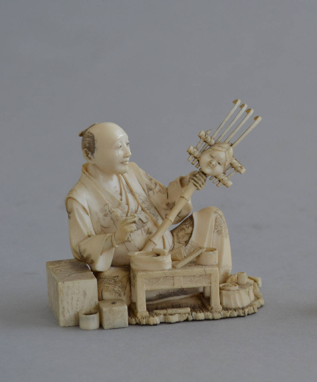 Scultura in avorio raffigurante un uomo seduto su una stuoia nel suo studio - laboratorio, con in mano un rastrello formato da una canna di bambù alla quale sono legati dei giunchi piegati e intrecciati. Sul dorso del rastrello è appesa la maschera femminile di Okame. L'uomo, che indossa una veste tradizionale a più strati decorata con foglie, racemi e ornati di fantasia, ha la gamba destra piegata internamente con il ginocchio che tocca terra, e la gamba sinistra portata avanti con il ginocchio alzato. I piedi sono scalzi. Attrono a lui si trovano: a sinistra una cassetiera, frontalmente un tavolino con pietra e tavoletta per l'inchiostro con a fianco una bacinella cilindrica con un bastoncino di legno; a destra una sezione di tronco d'albero con due piccoli recipienti circolari. Sotto il tavolino si trova un bulino, mentre a fianco del ginocchio sinistro una scatoletta quadrata e un contentore aperto, circolare, e dietro all'uomo una pialla e un cucchiaio di legno sqadrato. Il rastrello è danneggiato e ha perso quattro giunchi, mentre nella mano destra dell'uomo si trova solo l'estremità di quello che doveva essere un pennello. Sul fondo sono riprodotte le fascine della stuoia e ai margini uno scalpello. Al centro la firma in corsivo su lacca rossa.