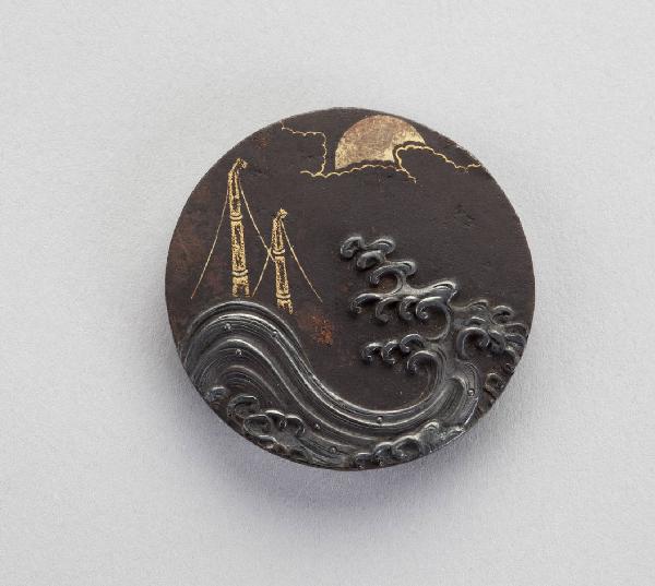 Elemento di netsuke del tipo kagamibuta, in bronzo patinato e dorato, a forma di bottone rotondo, raffigurante oche su uno sfondo con luna.
