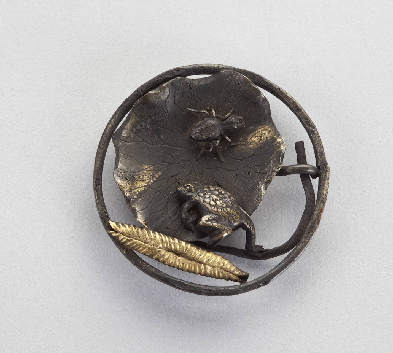 Elemento di netsuke del tipo kagamibuta, in bronzo patinato e dorato, a forma di bottone rotondo, raffigurante una foglia di loto, una rana e un ragno.