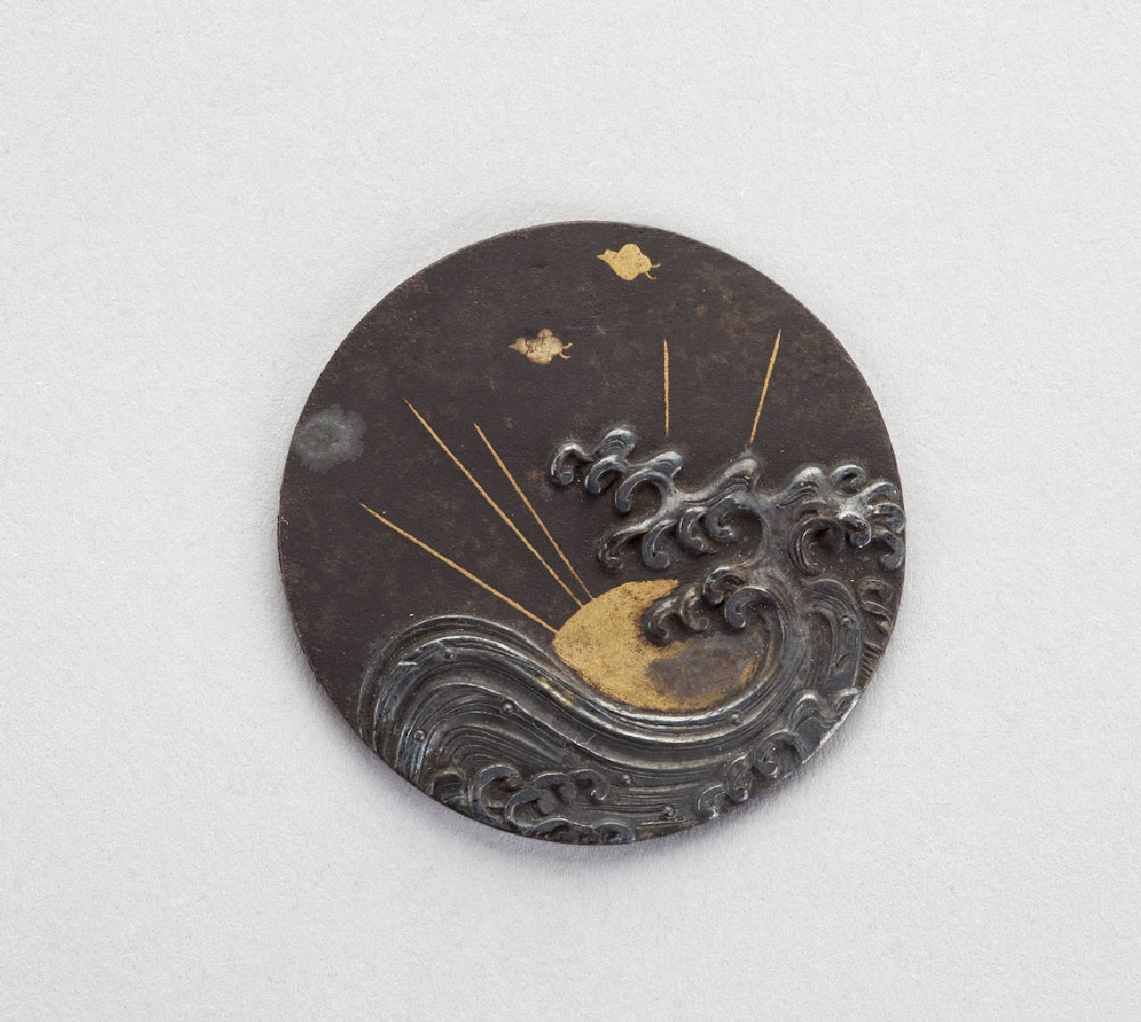 Elemento di netsuke del tipo kagamibuta, in bronzo patinato e dorato, a forma di bottone rotondo, raffigurante un sole e delle onde.