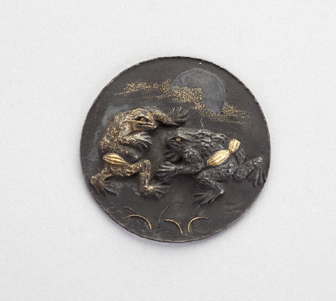 Elemento di netsuke del tipo kagamibuta, in bronzo patinato e dorato, a forma di bottone rotondo, raffigurante due lane che lottano come due umani.