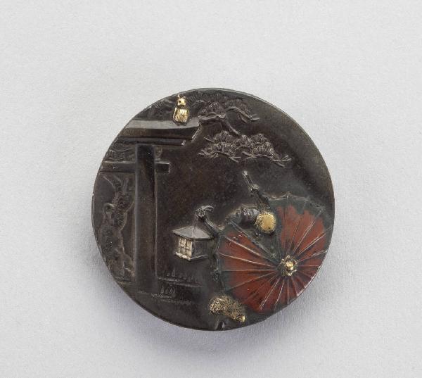Elemento di netsuke del tipo kagamibuta, in bronzo patinato e dorato, a forma di bottone rotondo, raffigurante un ombrello rotto.