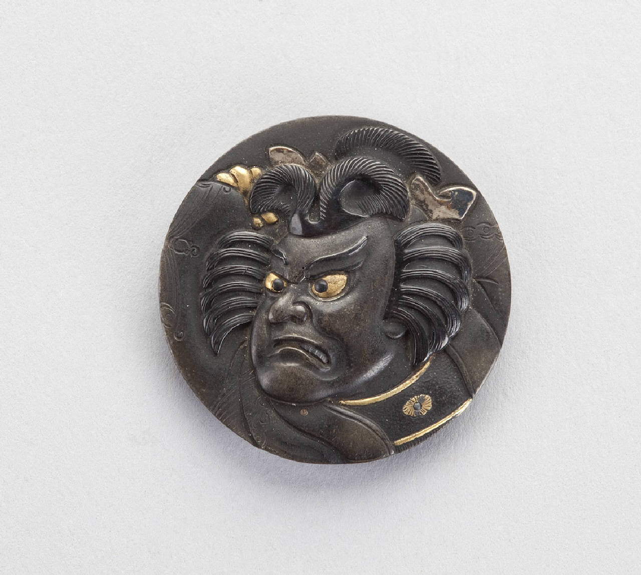 Elemento di netsuke del tipo kagamibuta, in bronzo patinato e dorato, a forma di bottone rotondo, raffigurante il viso di un attore nel ruolo di Sukeroku.