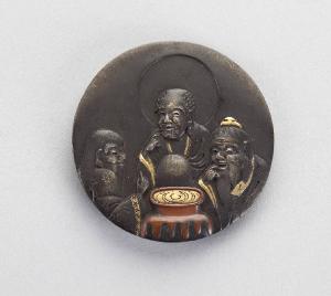 Elemento di netsuke del tipo kagamibuta, in bronzo patinato e dorato, a forma di bottone rotondo, raffigurante santo e due seguaci.